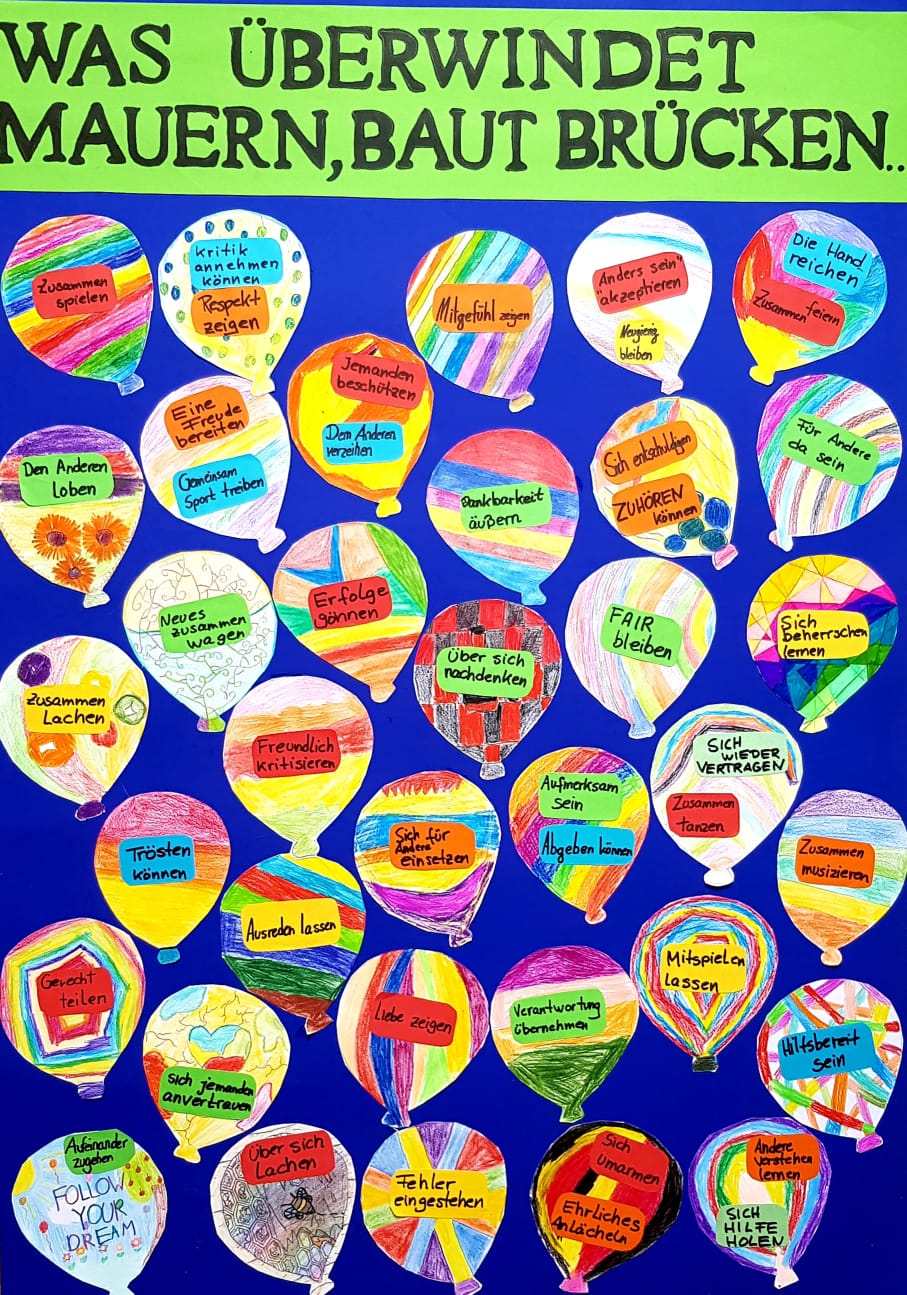 Aber auch dieses Jahr entstand etwas zum Jahrestag des Mauerbaus. Frau Sylls Schüler*innen gestalteten bunte Ballons und Texte dazu – im Vordergrund stand das Verbindende, um zum 60igsten Jahrestag mit einem positiven Plakat, der alten, aber durch die Zeitzeugenberichte immer noch aktuellen Ausstellung etwas die Traurigkeit zu nehmen. Die bunten Ballons mit den positiven Texten sollen den Betrachter zuversichtlich in die Zukunft blicken lassen. Die Schüler*innen hatten viel Freude an der Gestaltung und Erarbeitung: